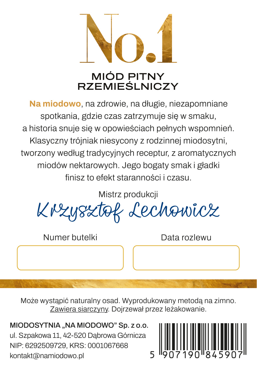 Ciało tego miodu pitnego jest krągłe, podkreślone tanicznością i przyjemnym ciepłem alkoholu. No.1 to charakterny trunek, który zachwyci koneserów i miłośników intensywnych wrażeń, przenosząc degustacje miodu pitnego na wyższy poziom.
